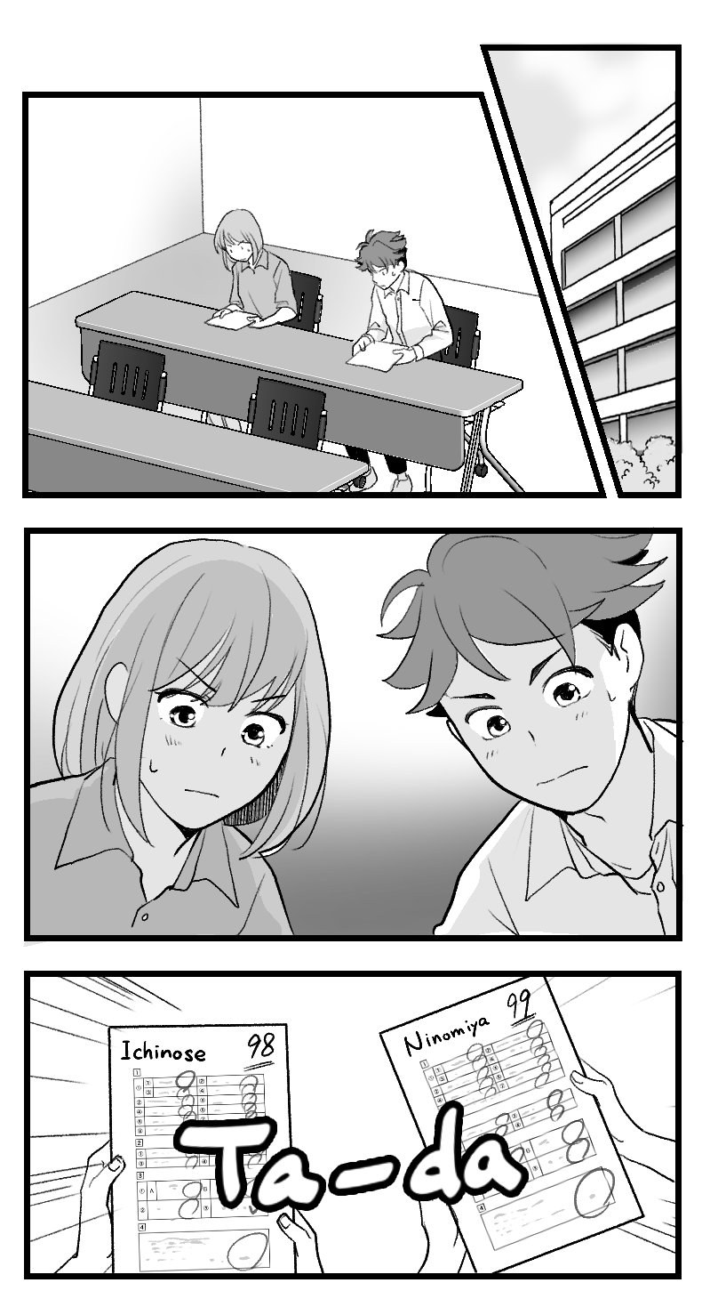 Ninomiya is in the same year as Ichinose. Her grades are always at the top. She has a strong personality, but she is also a hard worker and has a high opinion of Ichinose. She is in secret a big fan of Sugiken.