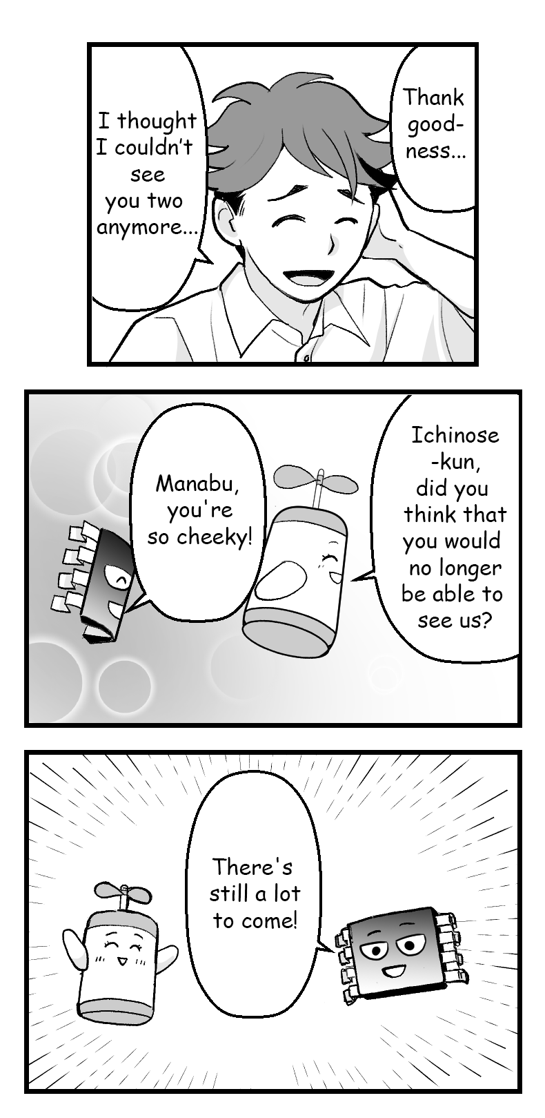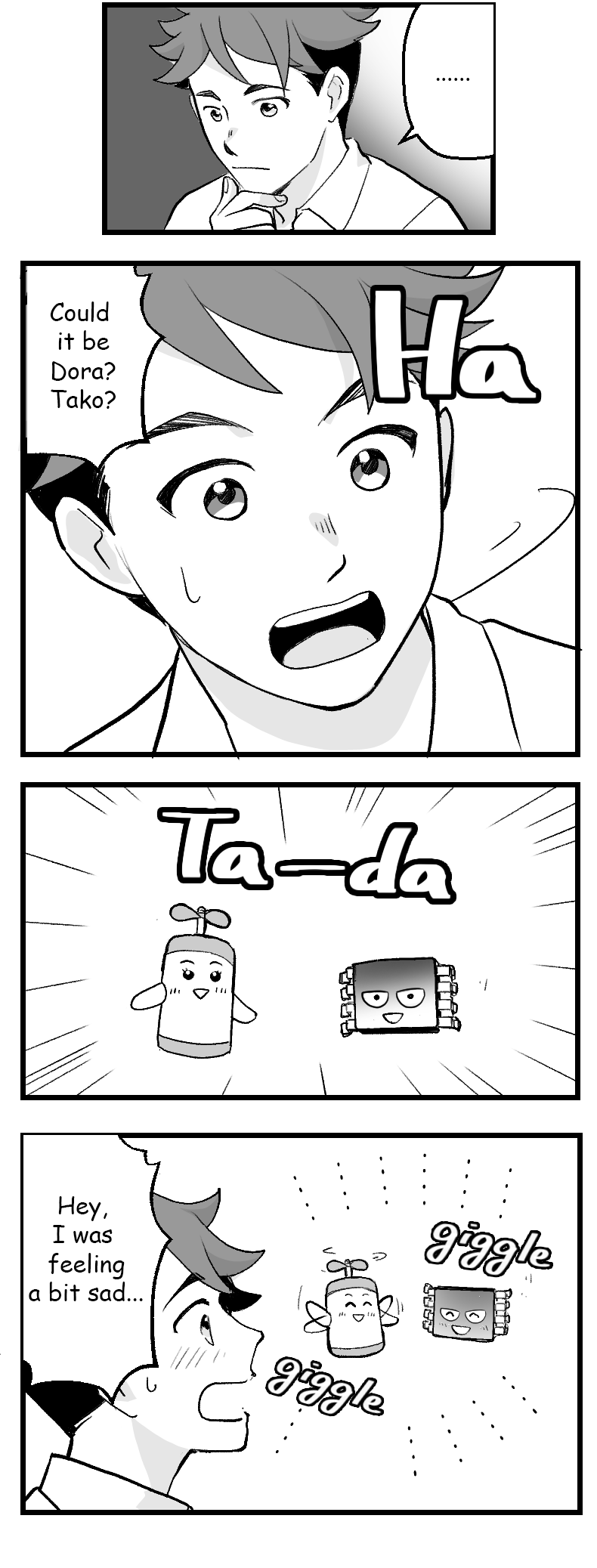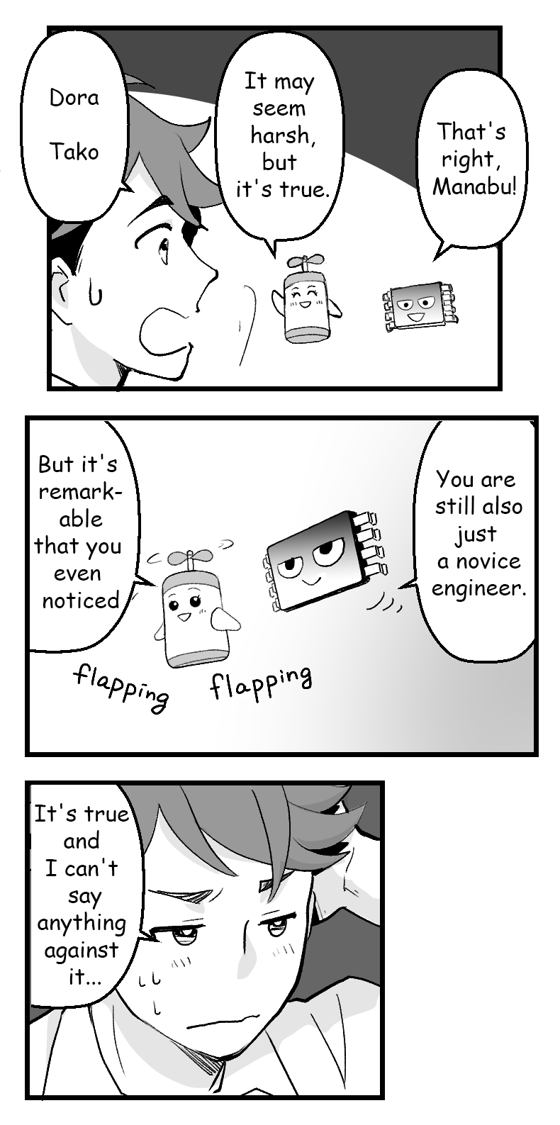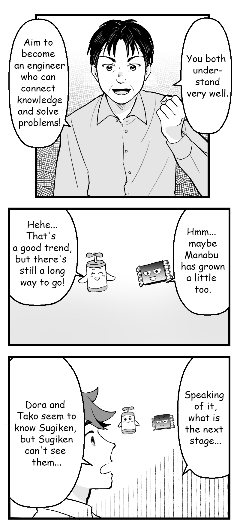 Ichinose (the protagonist) is a new engineer. He has been aiming to become an engineer since he was in middle school, and finally joined ROHM. He is so passionate that he forgets to eat and sleep while studying on motor drivers. Currently, only Ichinose can see Dora and Tako.